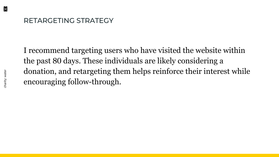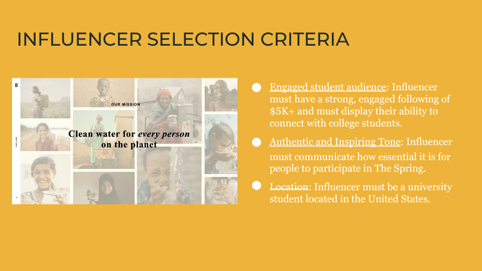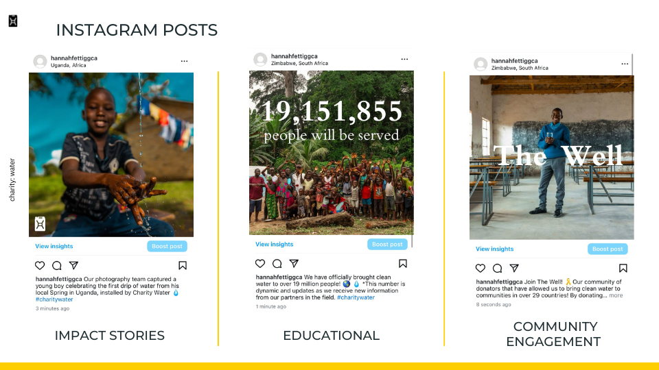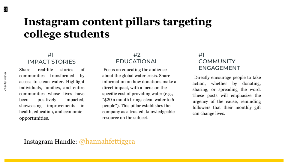 For this portfolio project, I developed a social media strategy for Charity: Water, a nonprofit dedicated to providing clean and safe drinking water worldwide. My focus was on creating The Spring, a program aimed at engaging younger audiences in recurring donations. This project involved devising a brand and content strategy tailored to this demographic. Using storytelling, social media engagement, and community-driven initiatives, I designed a campaign that made charitable giving more accessible and compelling for young donors.