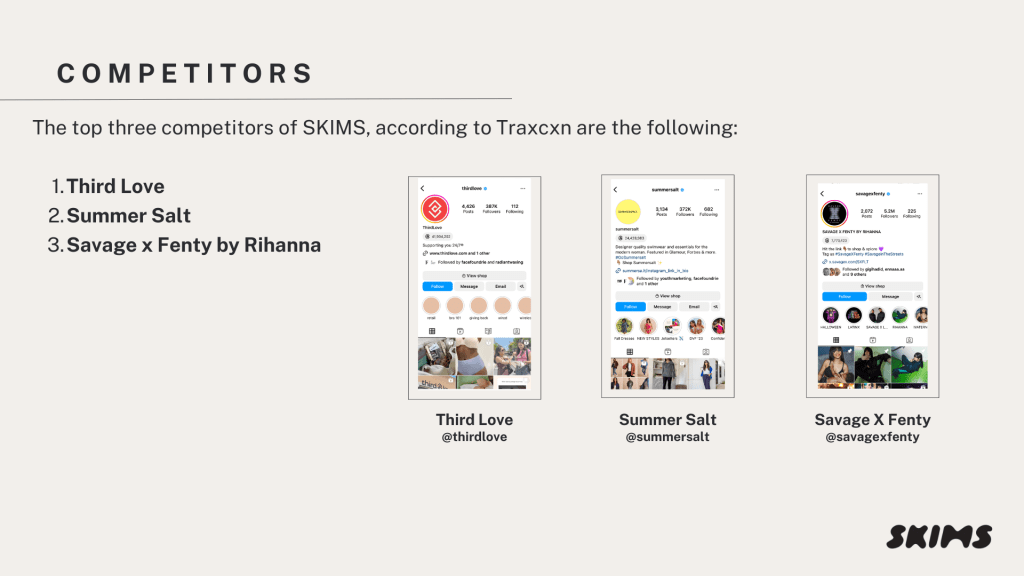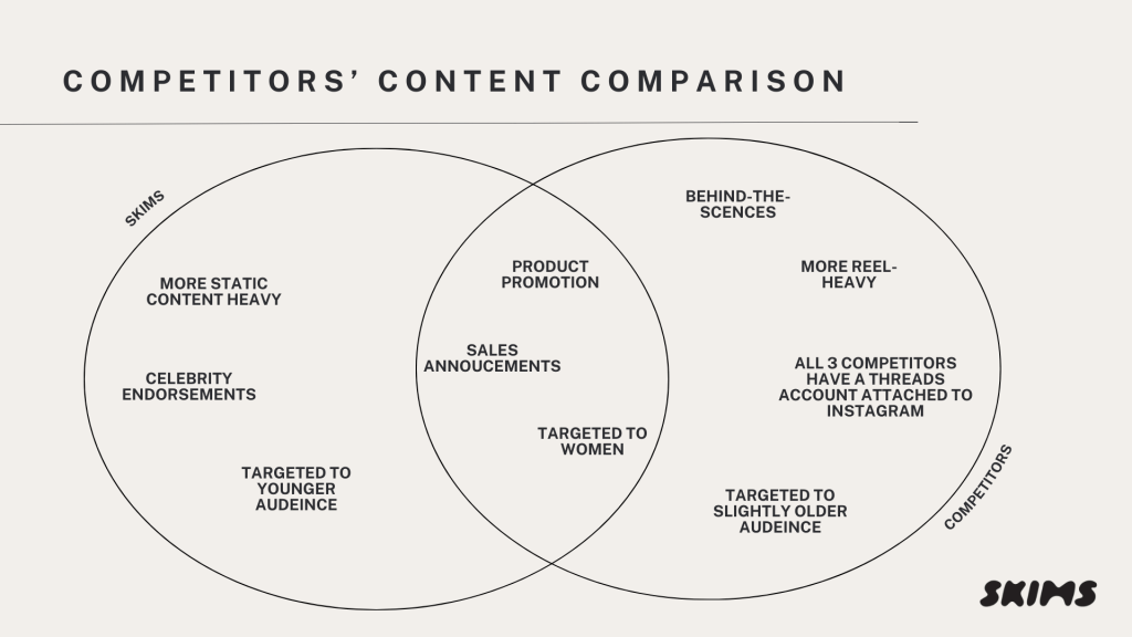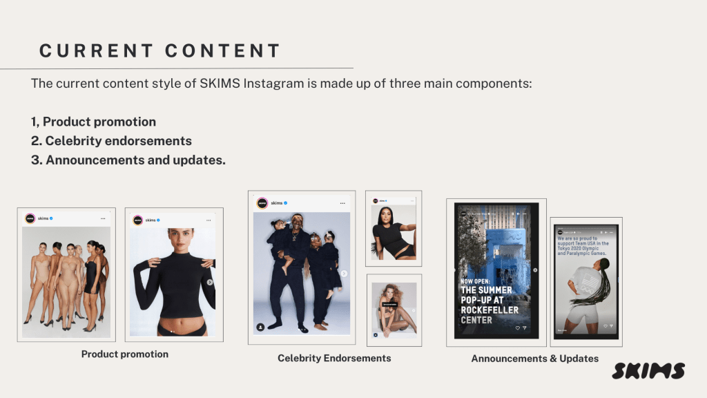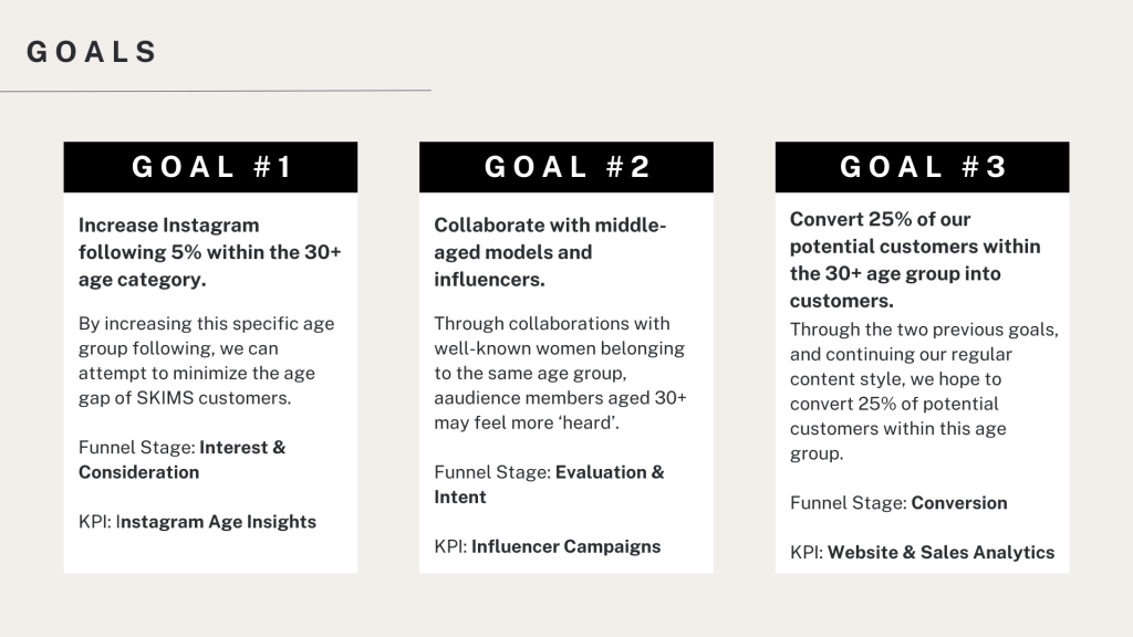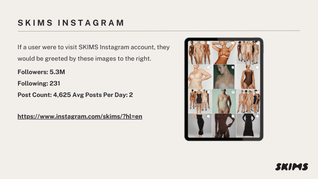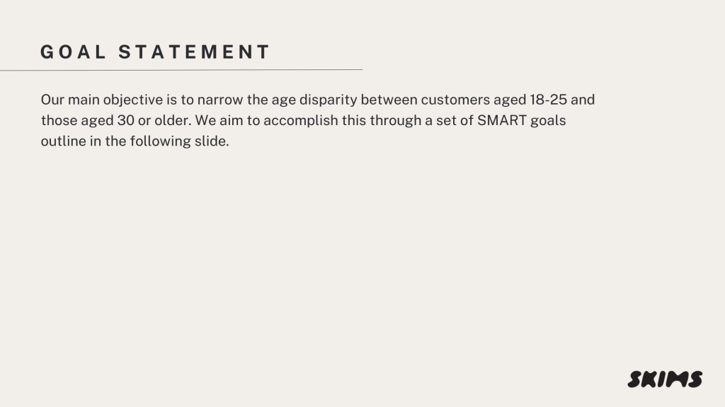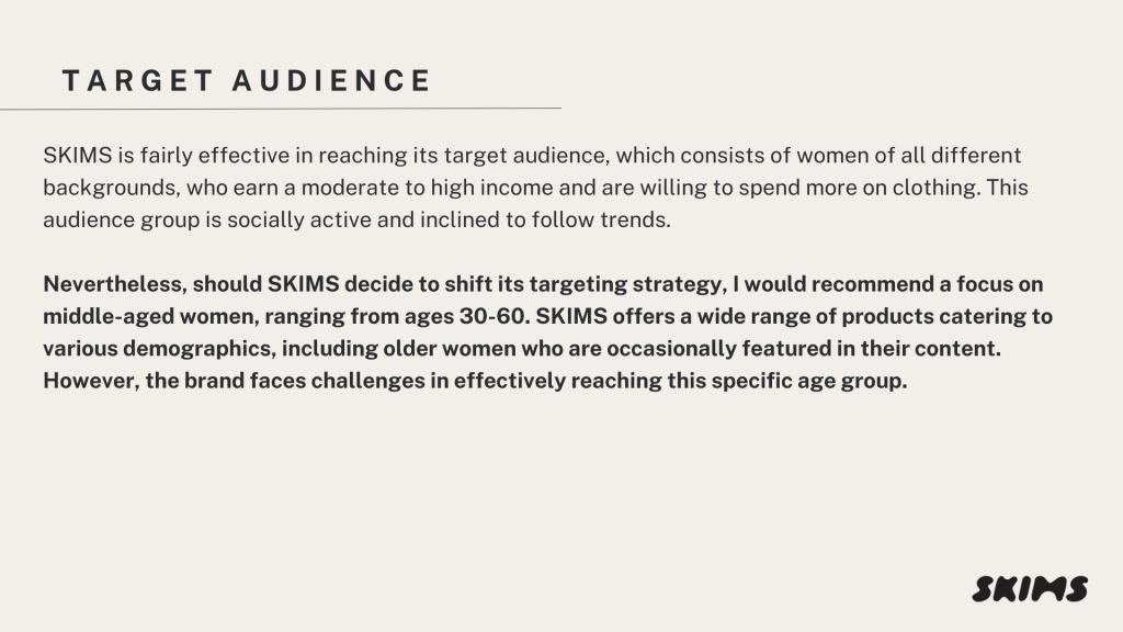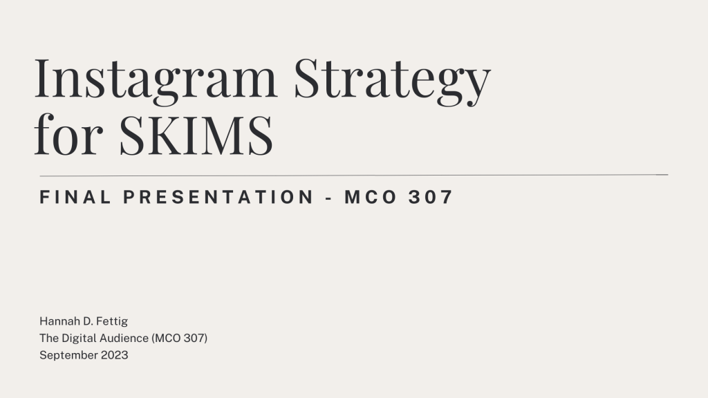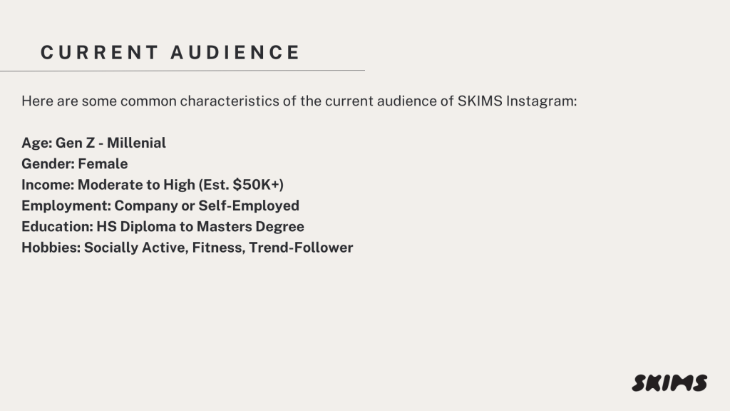 For this assignment, I developed a social media strategy for SKIMS. The goal was to bridge the age gap in SKIMS’ customer base by targeting an audience that was underrepresented in their existing online following. To achieve this, I conducted a detailed analysis of the current audience, performed an Instagram audit to assess content performance and engagement trends, and proposed S.M.A.R.T. goals to guide the brand’s strategy. Through these insights, I formulated recommendations to enhance SKIMS’ social media presence and connect with a more diverse age group.