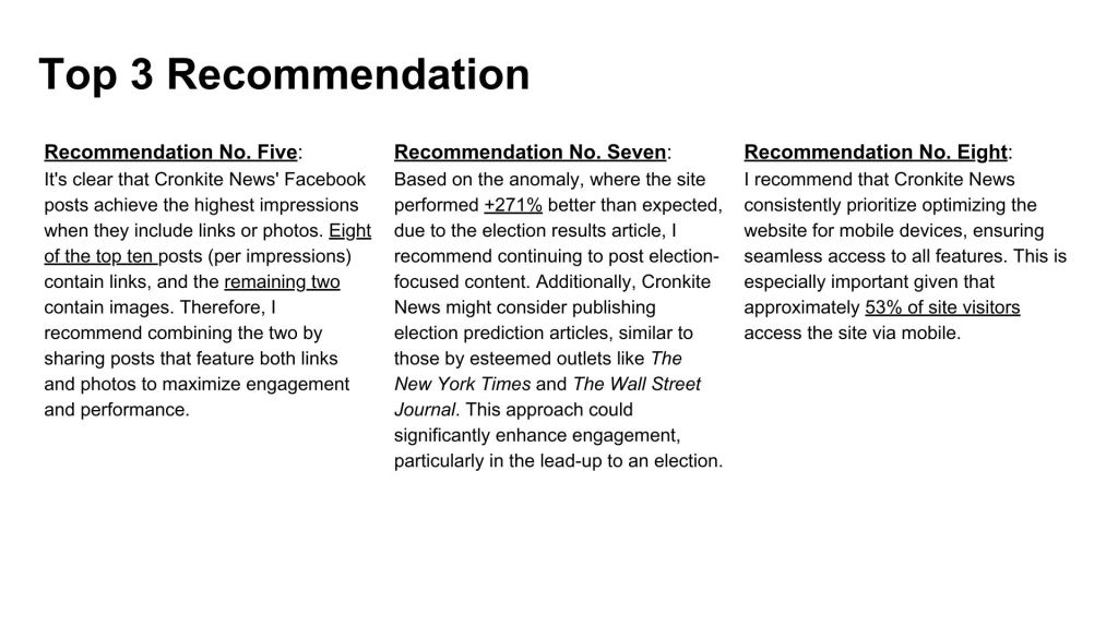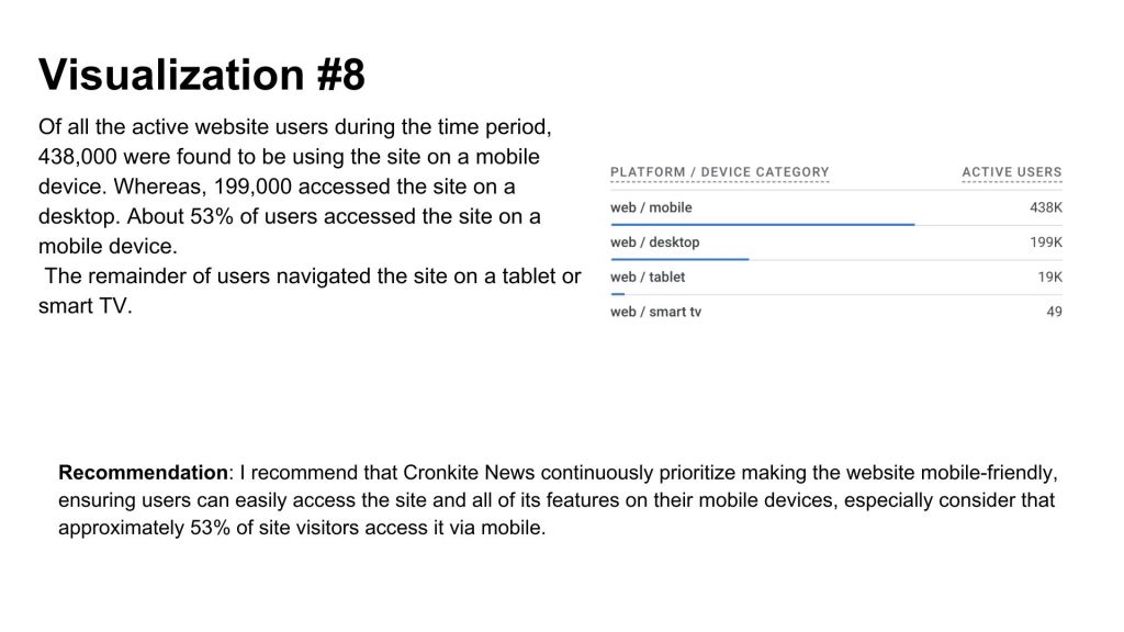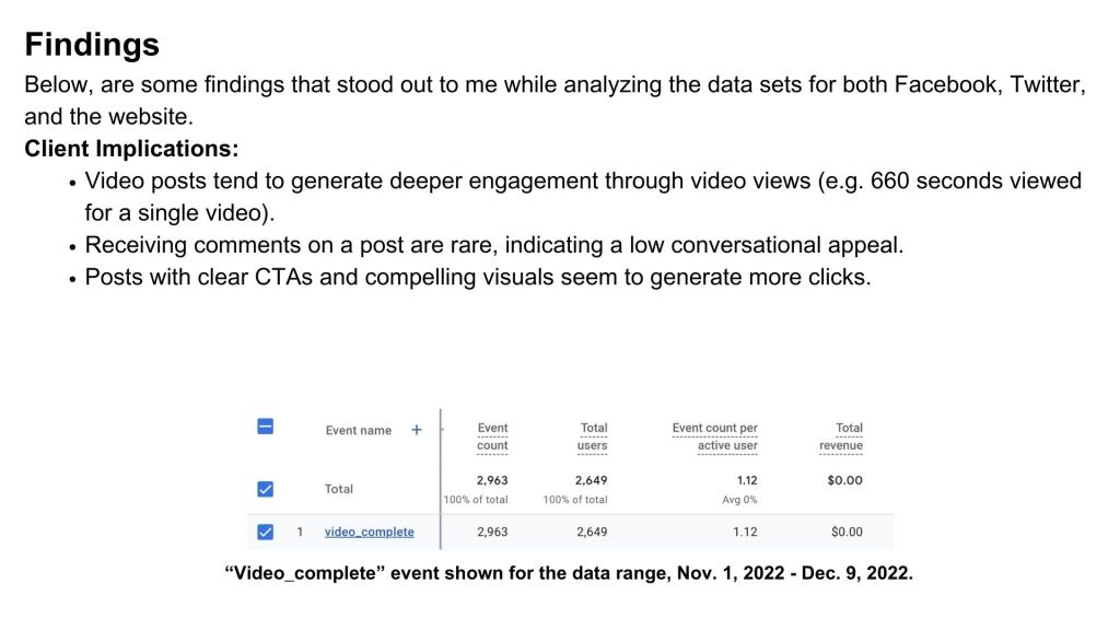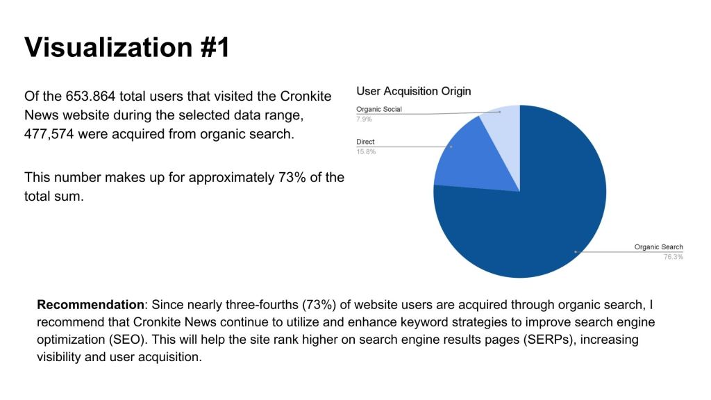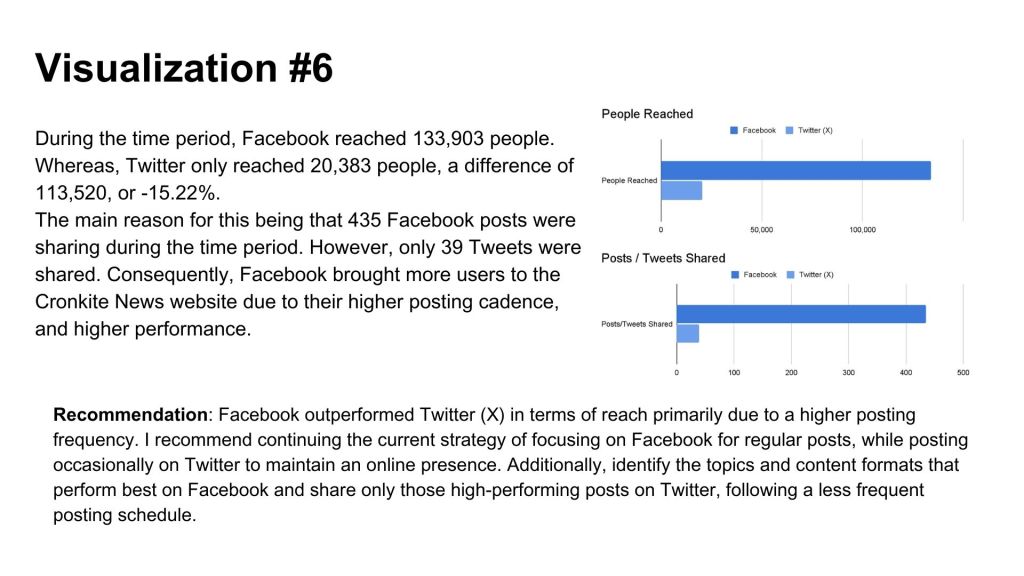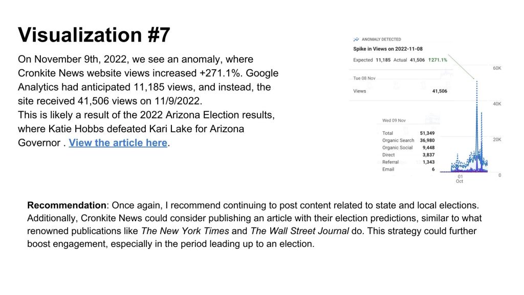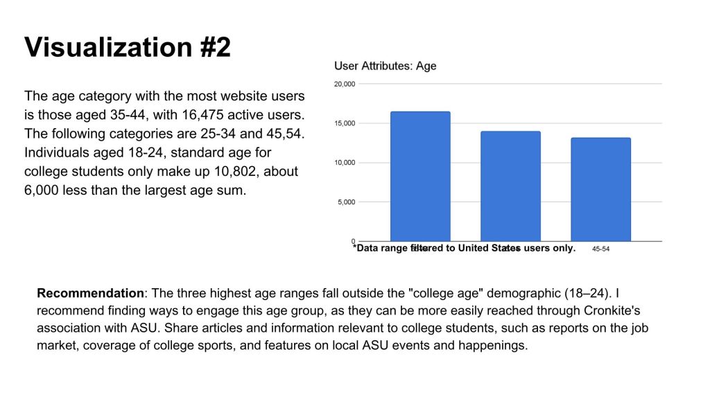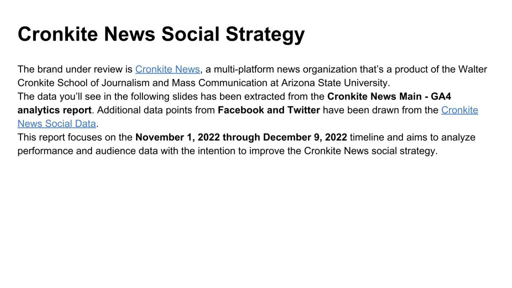 For my capstone project, I analyzed Cronkite News’ website and social media performance to identify strategies for attracting more high-quality users, who complete conversions My report examined audience segments, traffic patterns, and platform performance, uncovering key insights such as why Facebook outperformed Twitter and explaining anomalies like the spike in site traffic on certain dates. These findings informed data-driven recommendations to improve Cronkite News’ social media strategy.