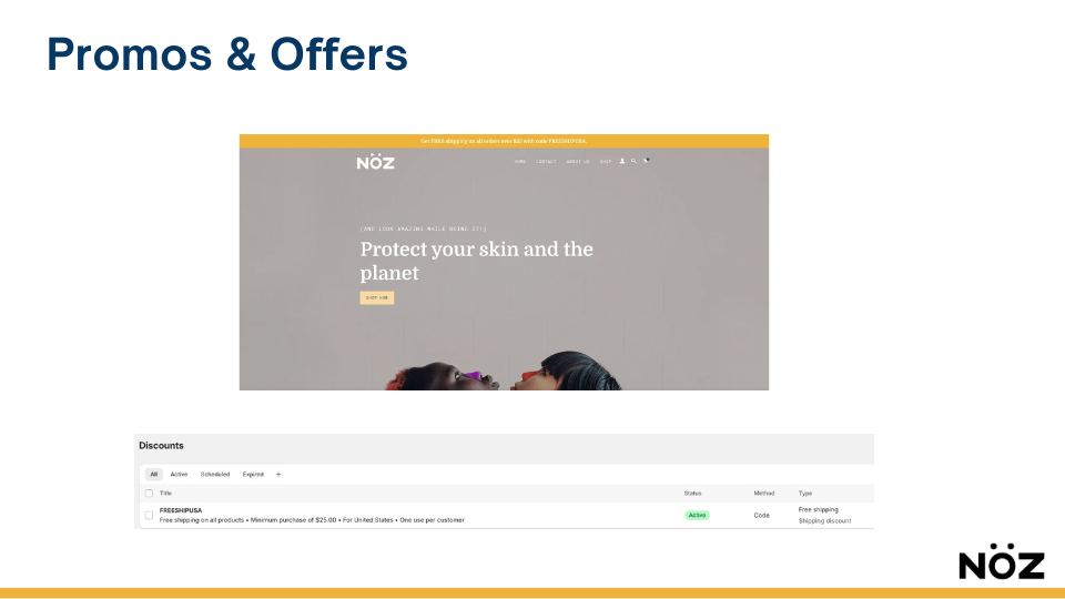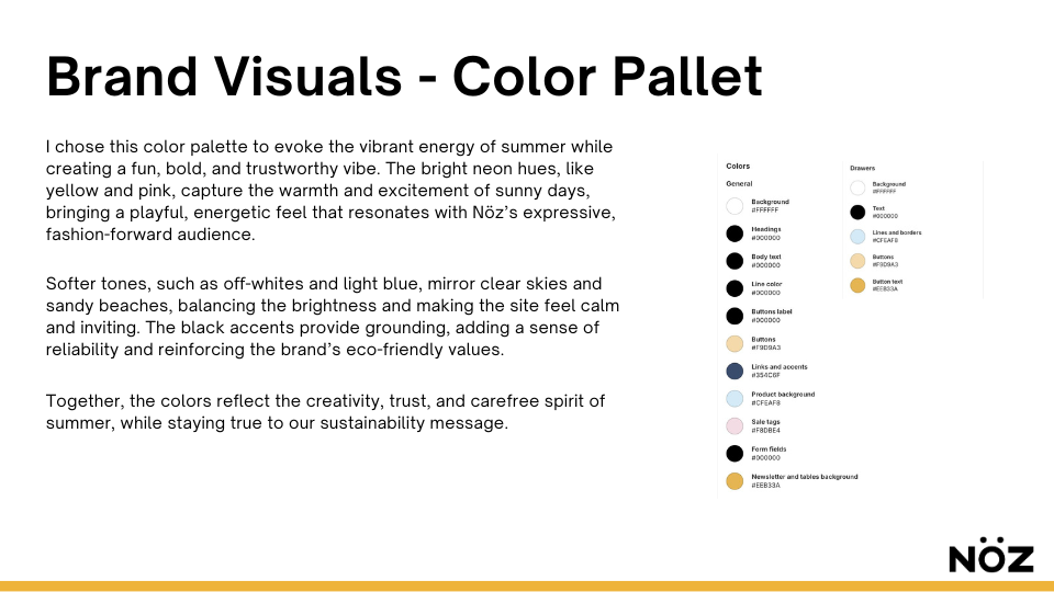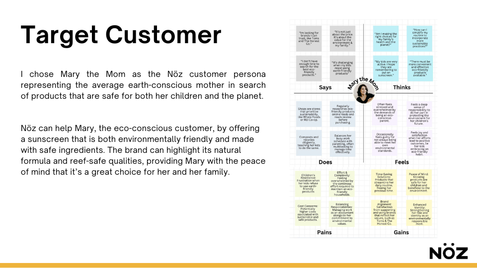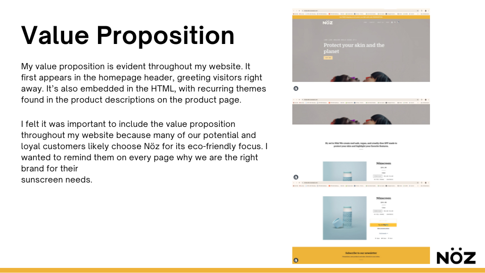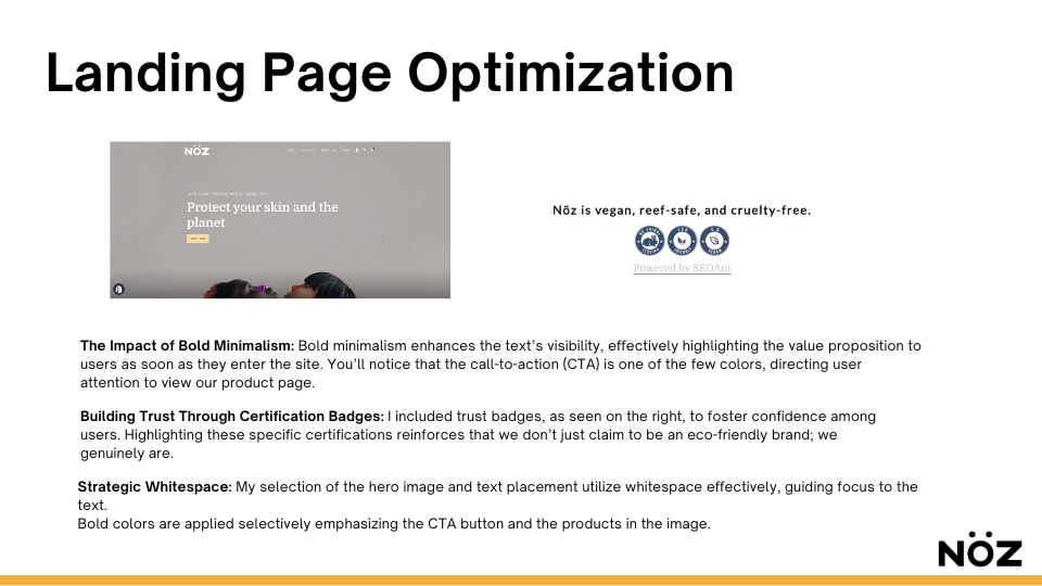 As part of the Global Career Accelerator, I designed and launched a fully functioning Shopify store for the reef-safe sunscreen brand Nöz. I developed a clear customer persona, crafted a strong value proposition, and implemented a vibrant, on-brand visual identity. I applied SEO best practices including high-volume keyword research, optimized meta tags, and strategic site architecture to drive discoverability. I also created and showcased paid ad campaigns using Google and Meta targeting tools, with a focus on behavior and demographics. My work included A/B testing strategies to boost conversions and social media tactics tailored for Instagram and TikTok. (Note: The store link has since expired, but you can access a tour of my site via the link on slide 10).